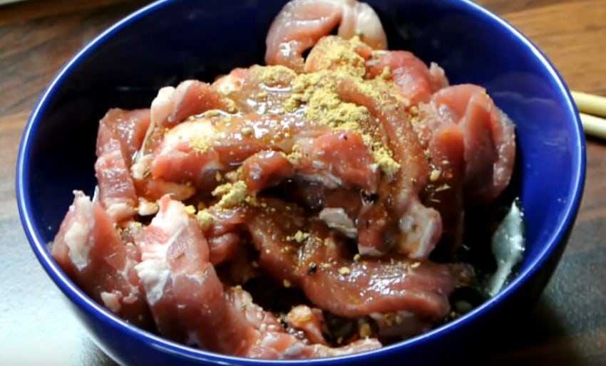 2. Куриное филе нарезать небольшими ломтиками и замариновать в соевом соусе и мелко натертом имбире в течение нескольких минут.