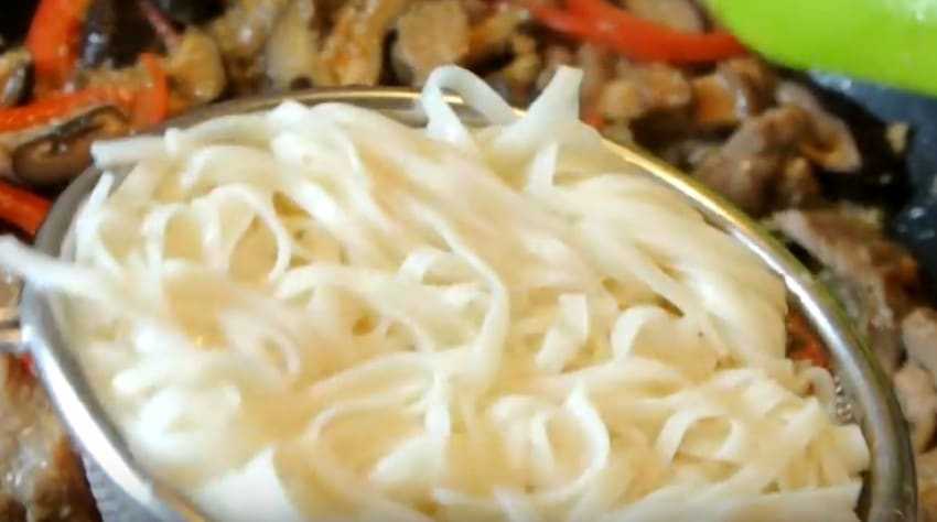 - Лапшу откидываем на дуршлаг, после отправляем на сковороду.