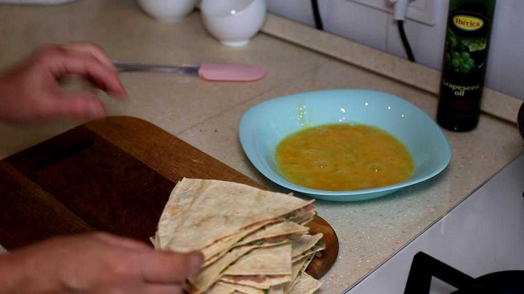 Приступаем к разделке лаваша: каждую лепёшку режем на несколько равных квадратов, затем квадраты превращаем в треугольники. Для большего удобства при нарезке лаваша можно использовать ножницы.