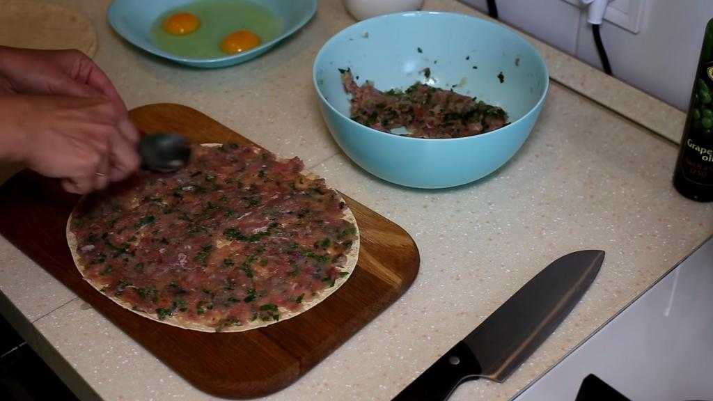 Шаг 5. Выкладываем на половину лепешки немного фарша. Ложкой разравниваем его равномерно, растягивая тонким слоем. Не забудьте оставить свободными края, примерно по сантиметру.