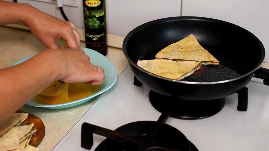 - Разогреваем сковородку (на растительном масле), затем выкладываем на раскалённое дно порции из тонкого лаваша с начинкой.