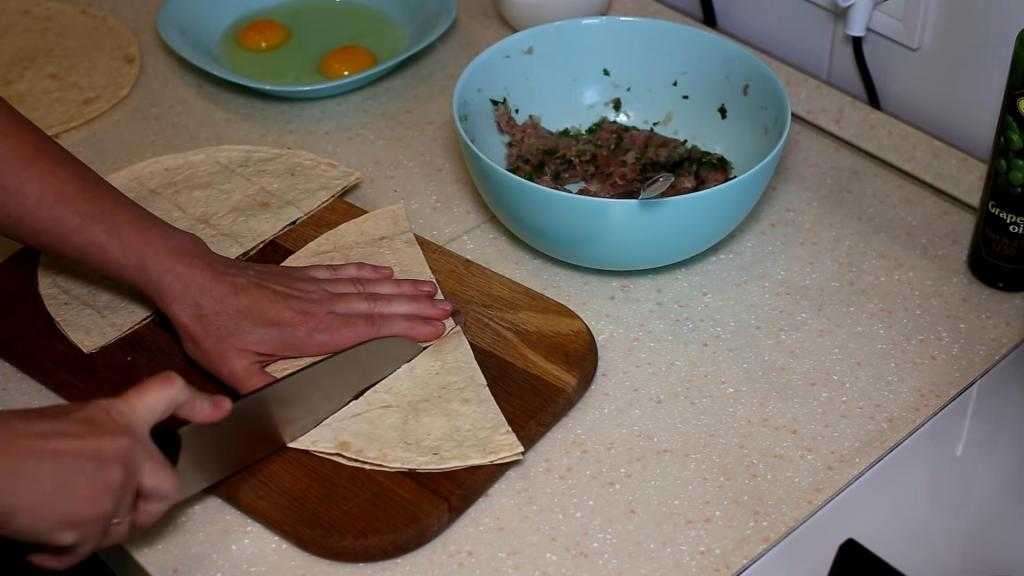 - Стоит помнить, что лаваш очень быстро засыхает, поэтому разрезать листы на чебуреки стоит непосредственно перед приготовлением.