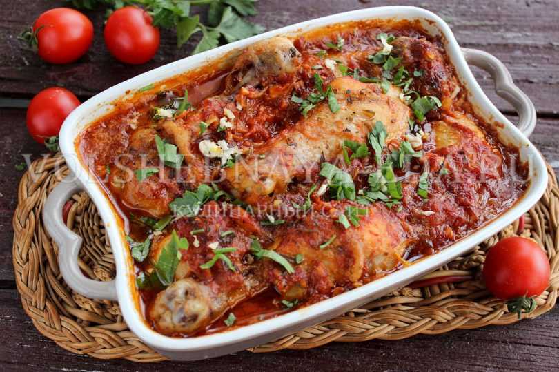 Курица сначала обжаривается, а затем запекается в духовке в томатном соусе до абсолютной готовности. Каждый кусочек пропитывается соусом и одновременно делится с ним своим вкусом. В итоге все мясные и овощные соки смешиваются между собой, получается цельное и очень вкусное блюдо.