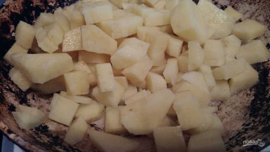 2. Затем добавляем крупно нарезанный картофель и обжариваем его минут 10, периодически помешивая.