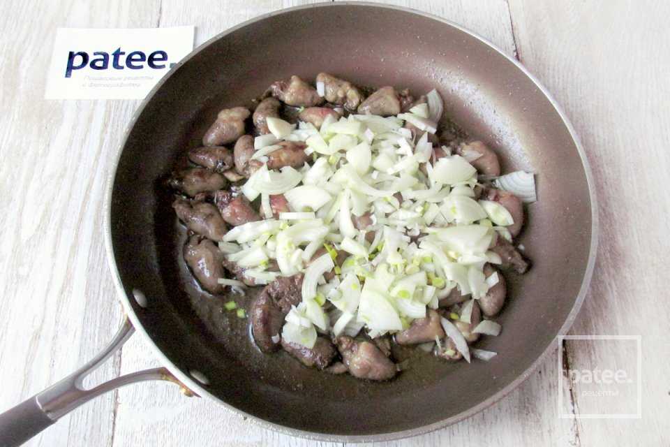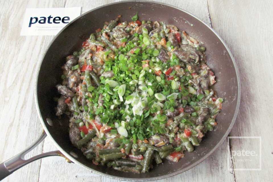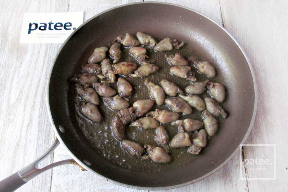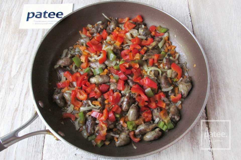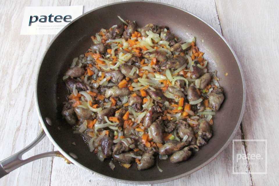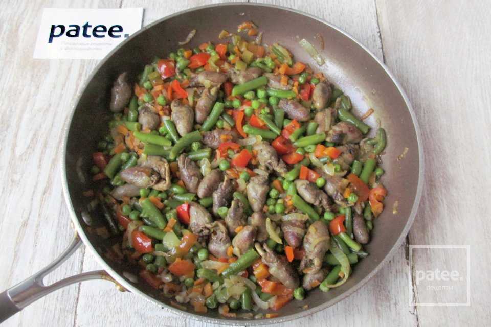 Соединяем с сердечками и жарим на среднем огне еще 5-7 минут, время от времени перемешивая.