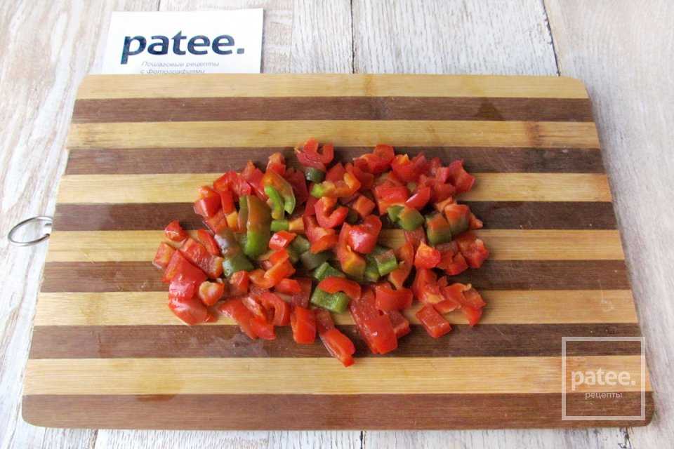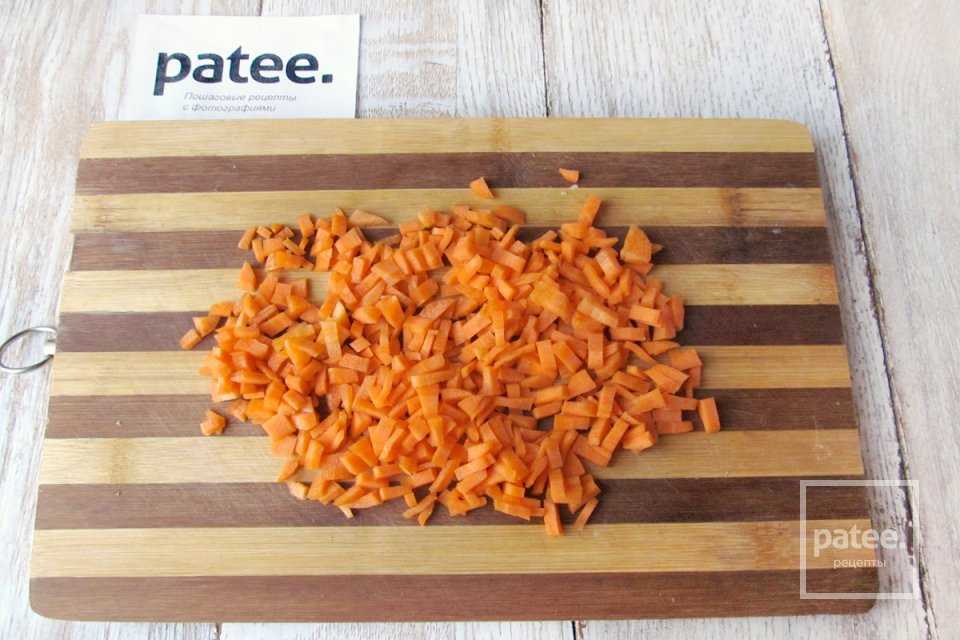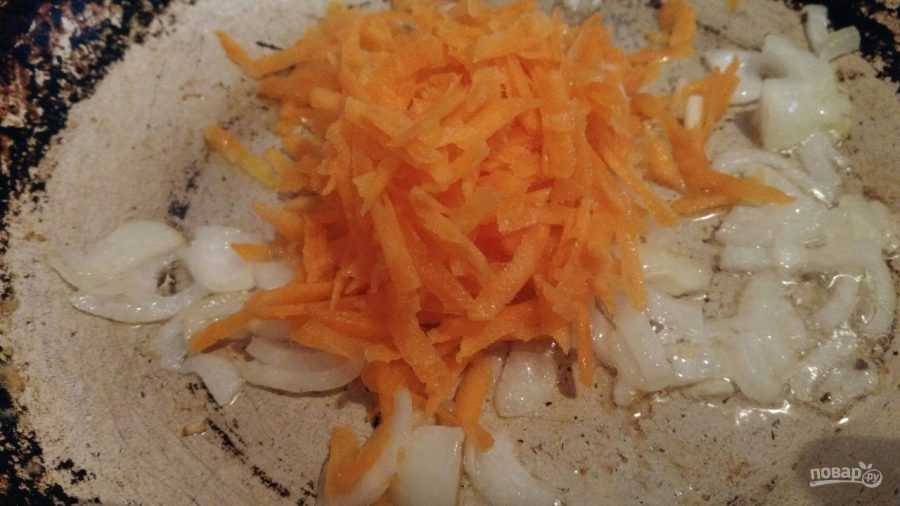 - Тем временем мелко режем луковицу, обжариваем на сковороде, затем добавляем к нему тертую на терку морковь и нарезанный мелко перец.