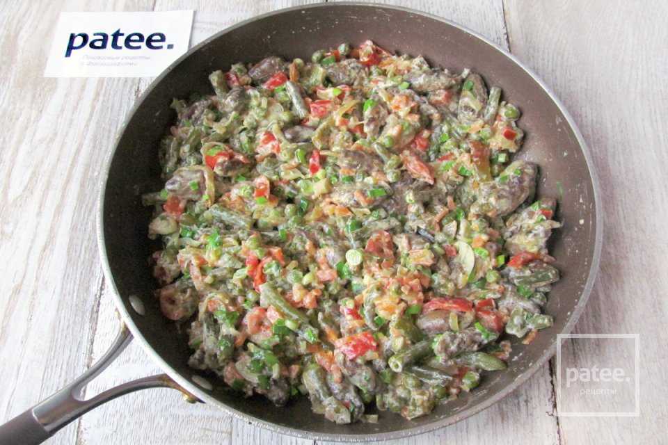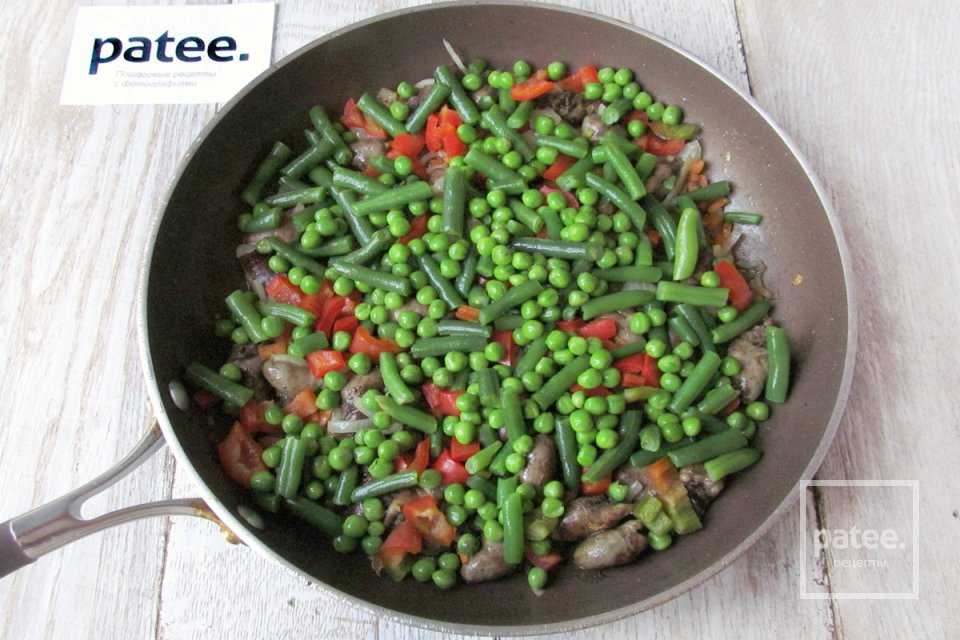 Предварительно размороженные горошек и стручковую фасоль заливаем кипятком на минуту, воду сливаем и перекладываем овощи в сковороду.