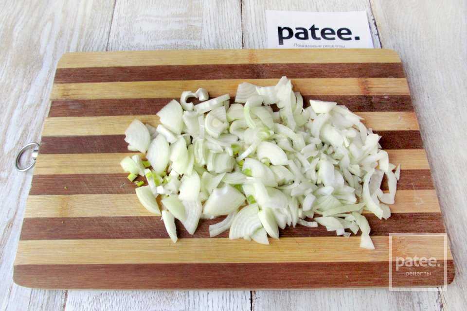 3. Очистить луковицу и порезать ее полукольцами. Старайтесь, чтобы их толщина была не тонкой, но и не толстой.