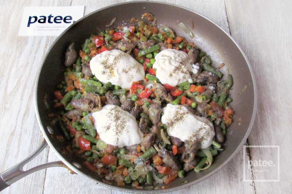 Добавляем соль и чёрный молотый перец по вкусу. Перемешиваем и, накрыв сковороду крышкой, на медленном огне тушим до готовности куриных сердечек, периодически перемешивая рагу.