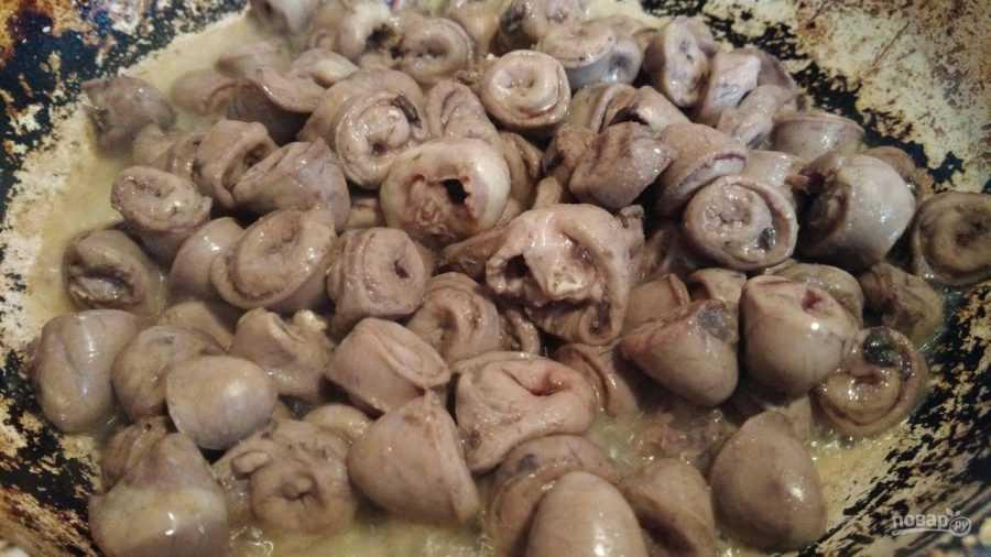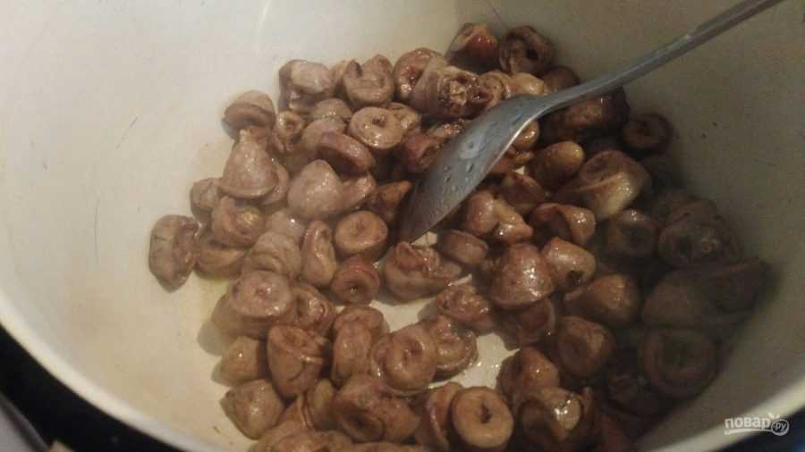 - У куриных сердечек отрезать сосуды, закинуть в сковороду и слегка обжарить в течение 2 минут.