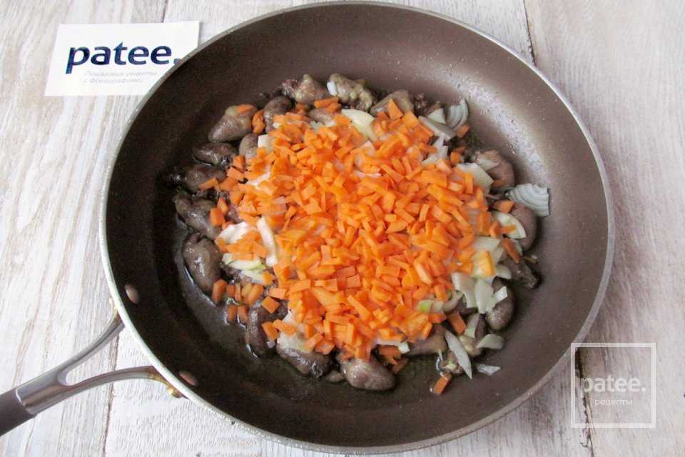 Обжариваем сердечки несколько минут на небольшом количестве растительного масла. Добавляем морковку.