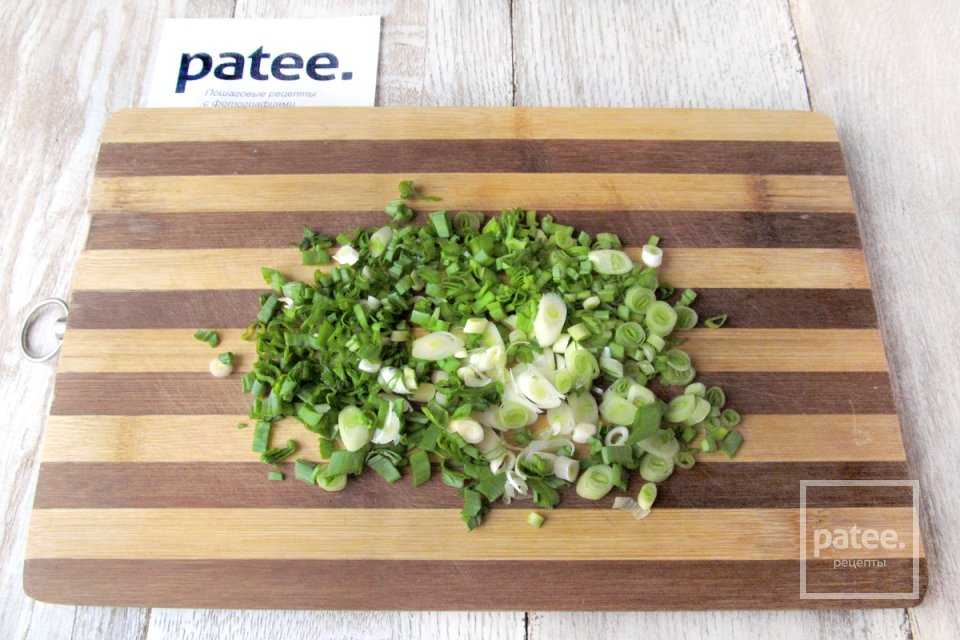 Зелёный лук промываем и нарезаем тонкими колечками.
