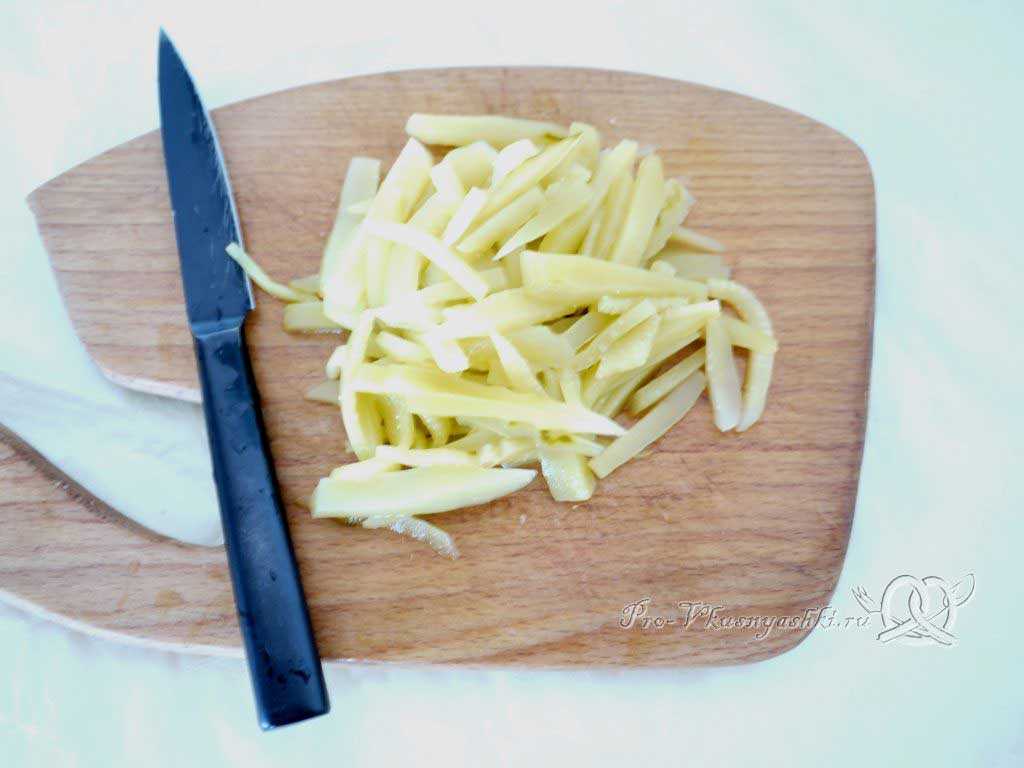Все свежие овощи очищаем и нарезаем мелкими кубиками, огурчики же, напротив, режем строго соломкой. Вынув сварившуюся курятину, опускаем в бульон картофель, а лук с морковью прогреваем на постном масле до момента, когда лук начнёт подрумяниваться.