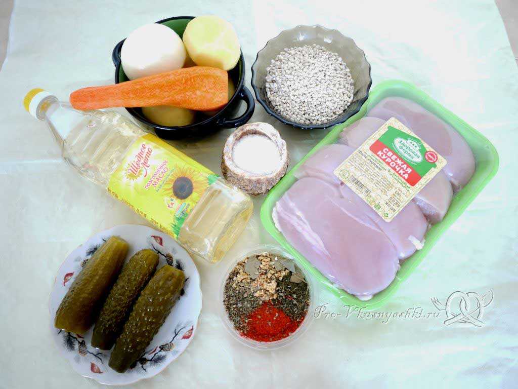 Кроме овощей, крупы и мяса, вам понадобятся маринованные огурцы.