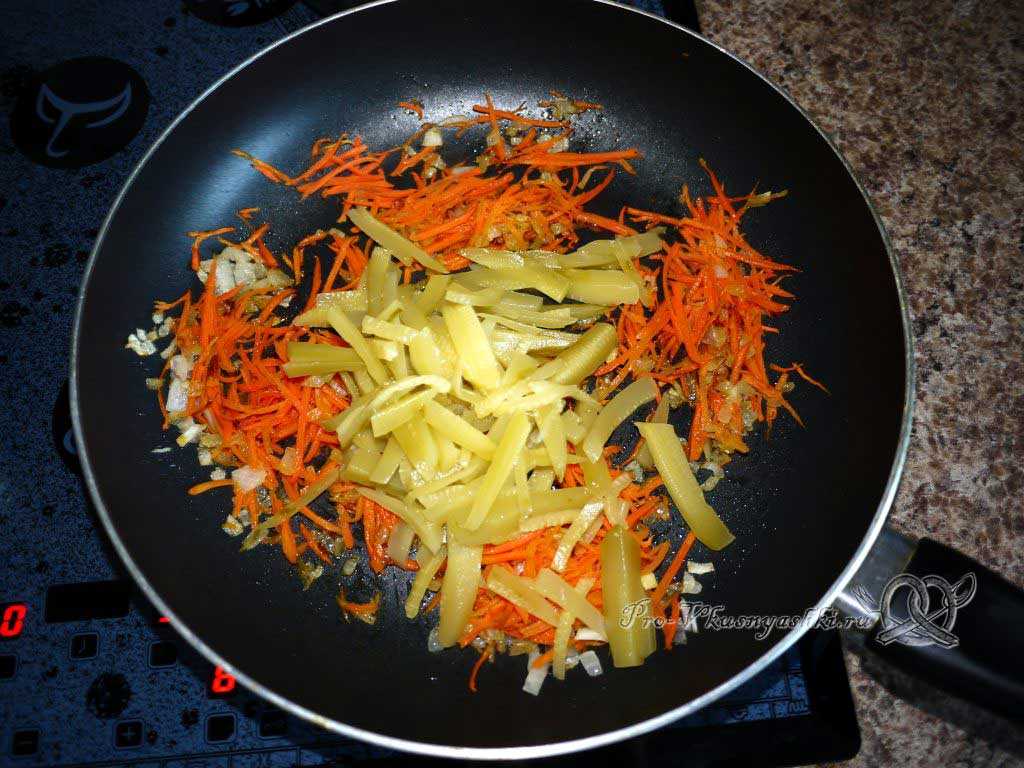 С луком и огурцами – первый вариант, с луком и морковью – второй вариант. И в том, и в другом случае зажарить лук до золотистого цвета и затем добавить огурцы (или морковь) и слегка протушить около 15 мин.