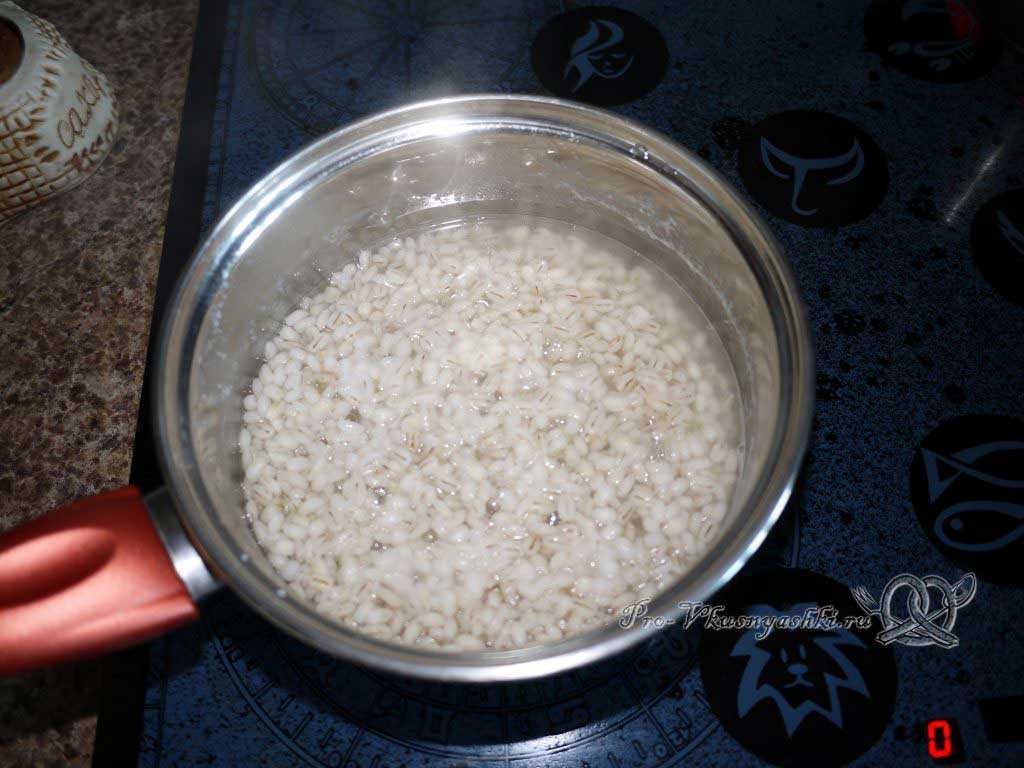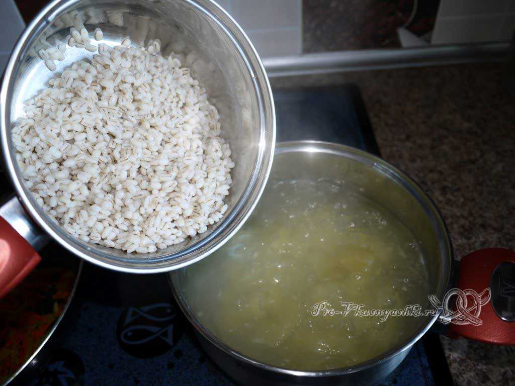Шаг 1. Перловую крупу пересыпьте в кастрюлю и промойте ее несколько раз. Затем налейте в кастрюлю с крупой воду и поставьте вариться крупу до полуготовности. Она еще дойдет в процессе приготовления заправки, а потом еще, когда будете непосредственно варить суп.