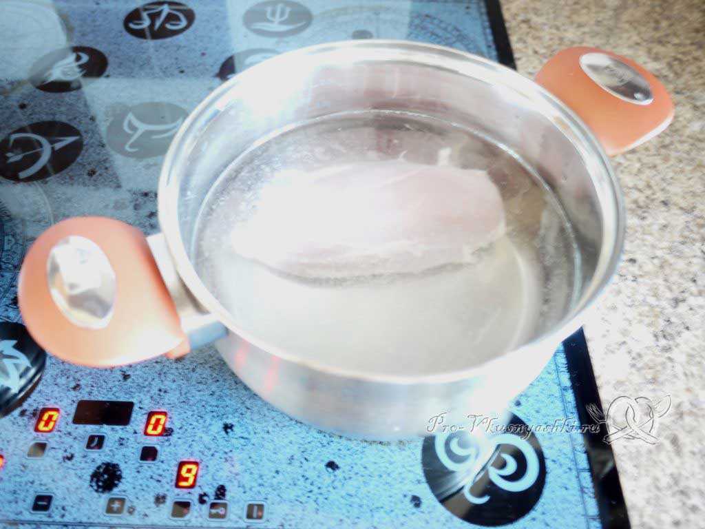 Варим, обмытый и разрезанный кусочками помельче, окорочок, залив водой, объёмом 2,7 литра