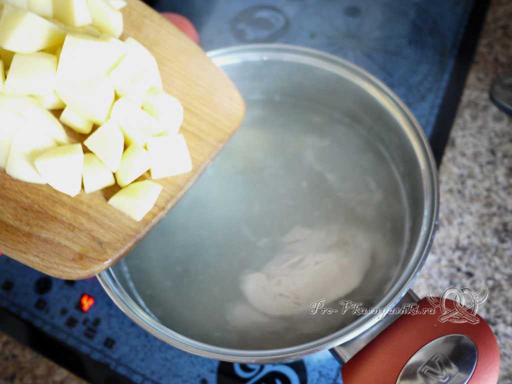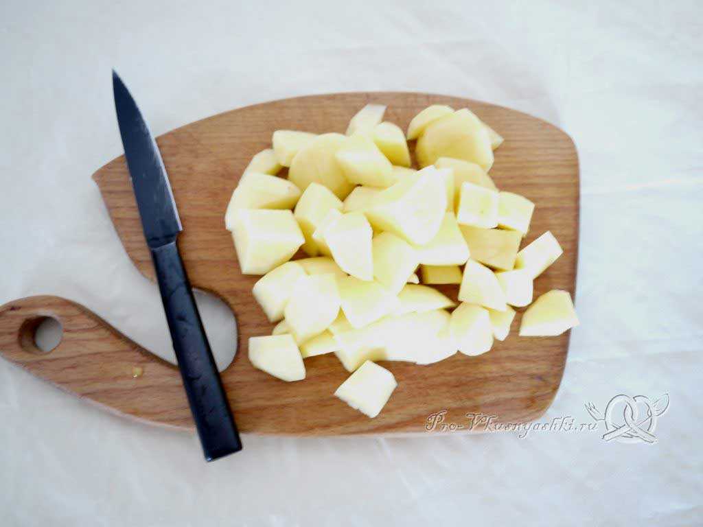 Далее нужно чистить и порезать картофель, добавить его в суп и варить 10 мин.
