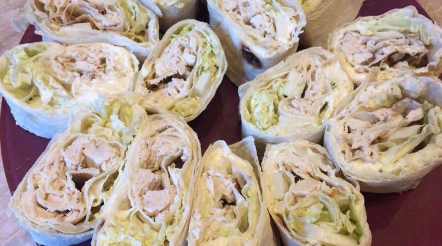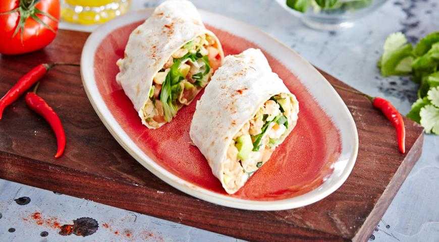 - Сверните лаваш с курицей рулетом, подвернув края внутрь.