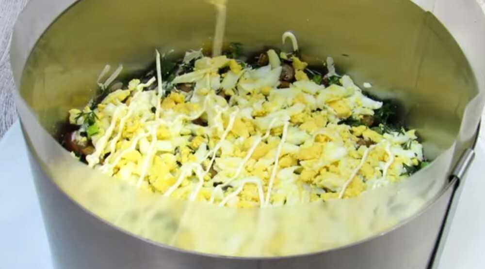 Куриные яйца отвариваем заранее и натираем на крупной терке. Выкладываем после зелени половину порции, промазываем слой майонезом.