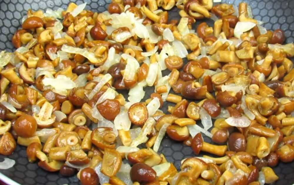 В это время очищаем лук от кожицы и измельчаем. Сковороду ставим на плиту, наливаем растительное масло и отправляем в неё лук, обжариваем до прозрачности. Далее отправляем к нему маринованные опята, обжариваем минут 5-7. Снимаем с огня и ждем, когда остынут.