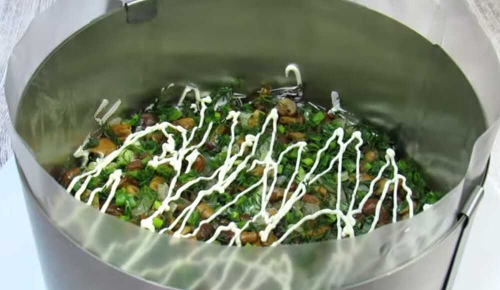 После грибов посыпаем 1/2 частью измельченной зелени, поливаем майонезом.