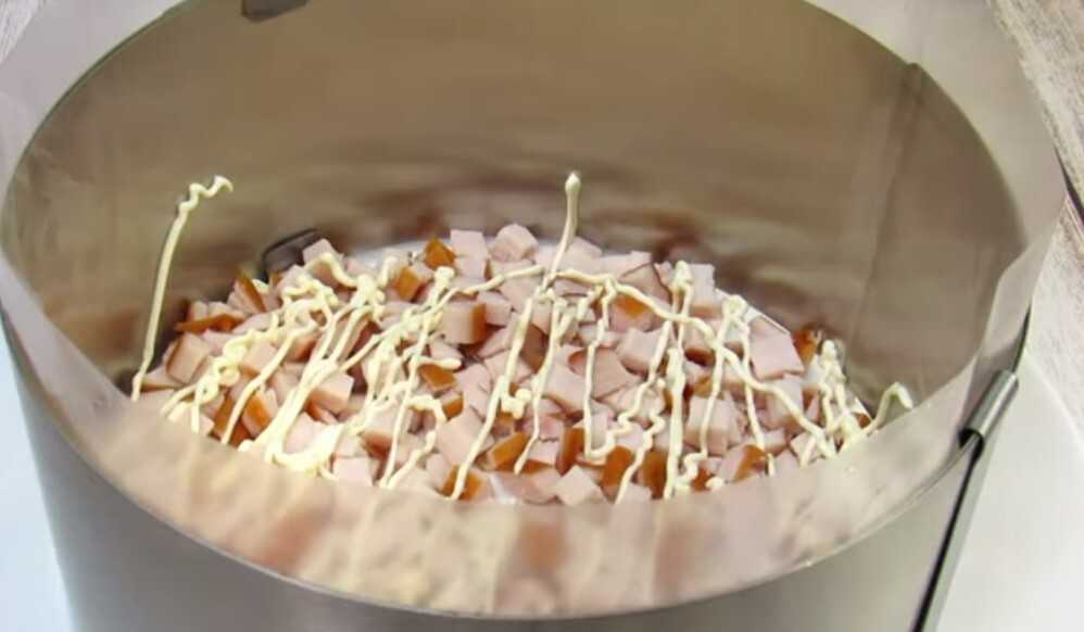7.Можно начинать сборку кулинарного чуда. На плоское блюдо поставьте кольцо (можно взять от разъемной формы). Выложите первым слоем копченую курицу и ложкой ее уплотните. Смажьте тонко майонезом. Не переборщите с соусом, много его здесь не нужно.