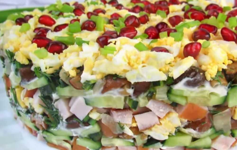 Слоеный салат с копченой куриной грудкой и жареными грибами