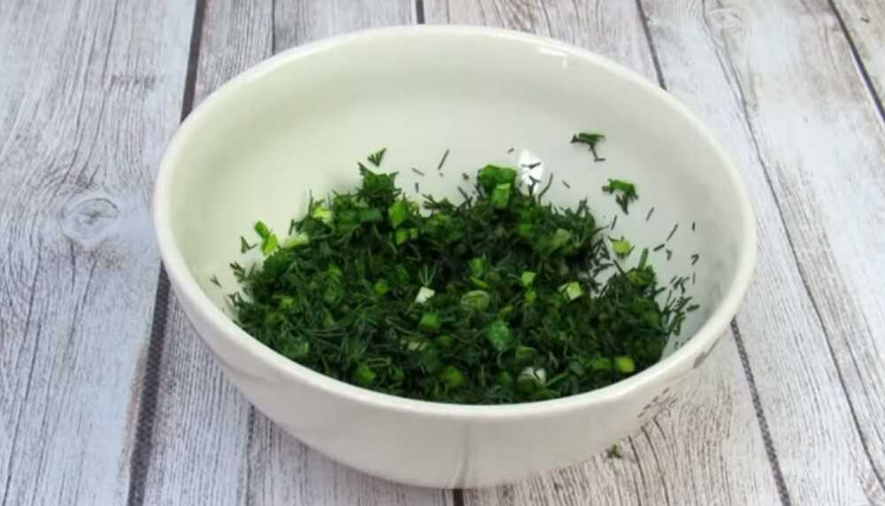 Зеленый лук и укроп хорошо промываем и измельчаем ножом. Соединяем их вместе в одной ёмкости.