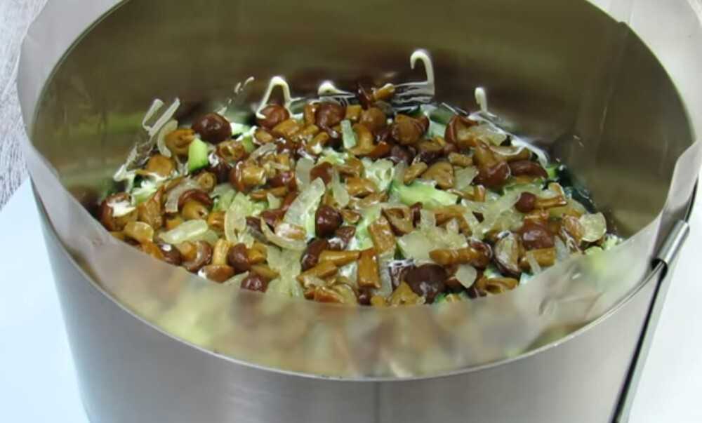 Сочетание курицы и грибов классическое. Салат с этими продуктами не может быть не вкусным, если вы ничего не сожжете на сковороде. К тому же, он будет красиво оформлен слоями с помощью кольца.