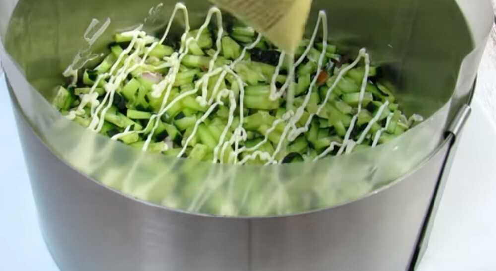 Следующим слоем кладем половинку измельченных мелко огурцов, так же промазываем майонезом.