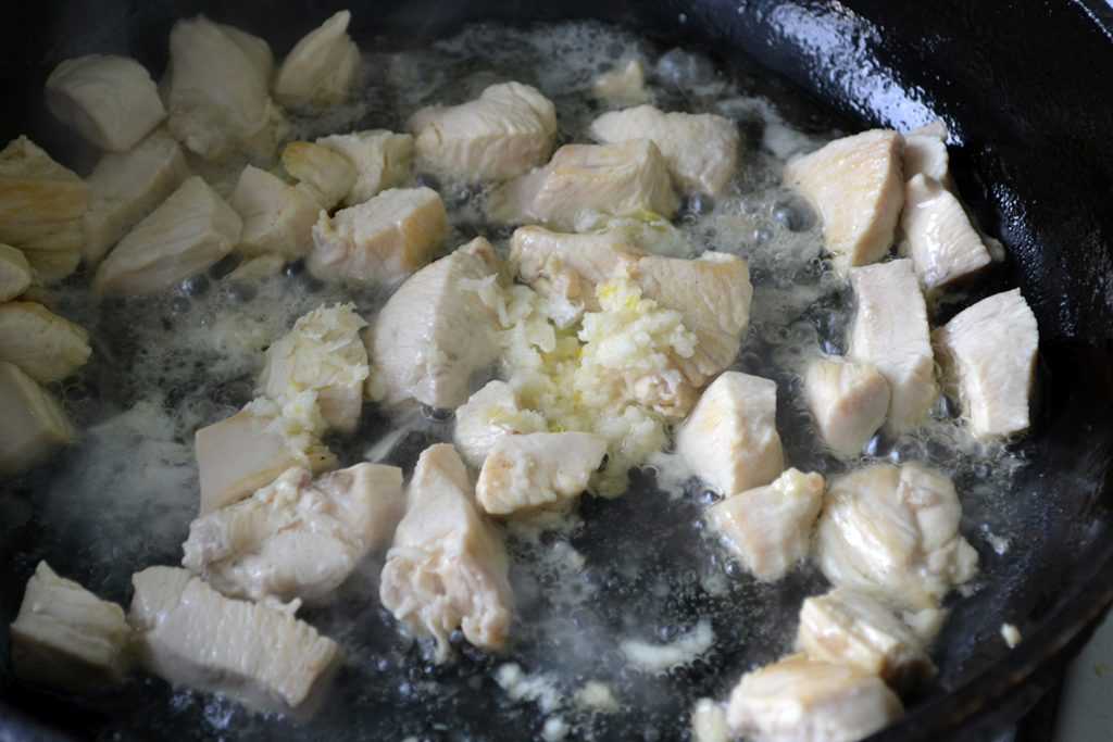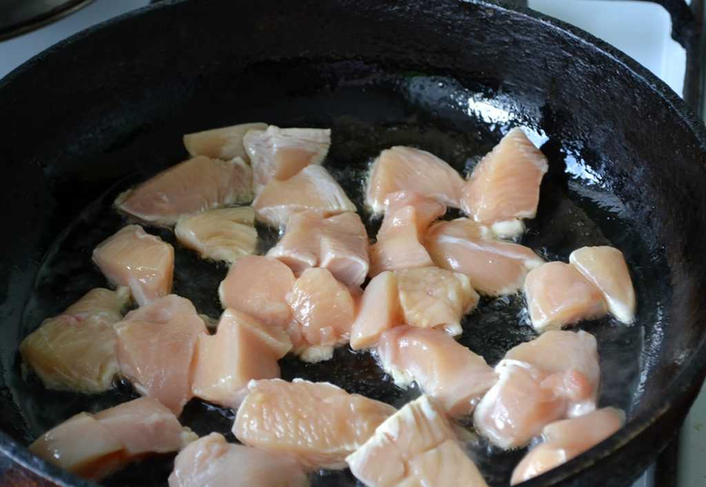 - Курицу порежьте небольшими кубиками, обжарьте на медленном огне.
