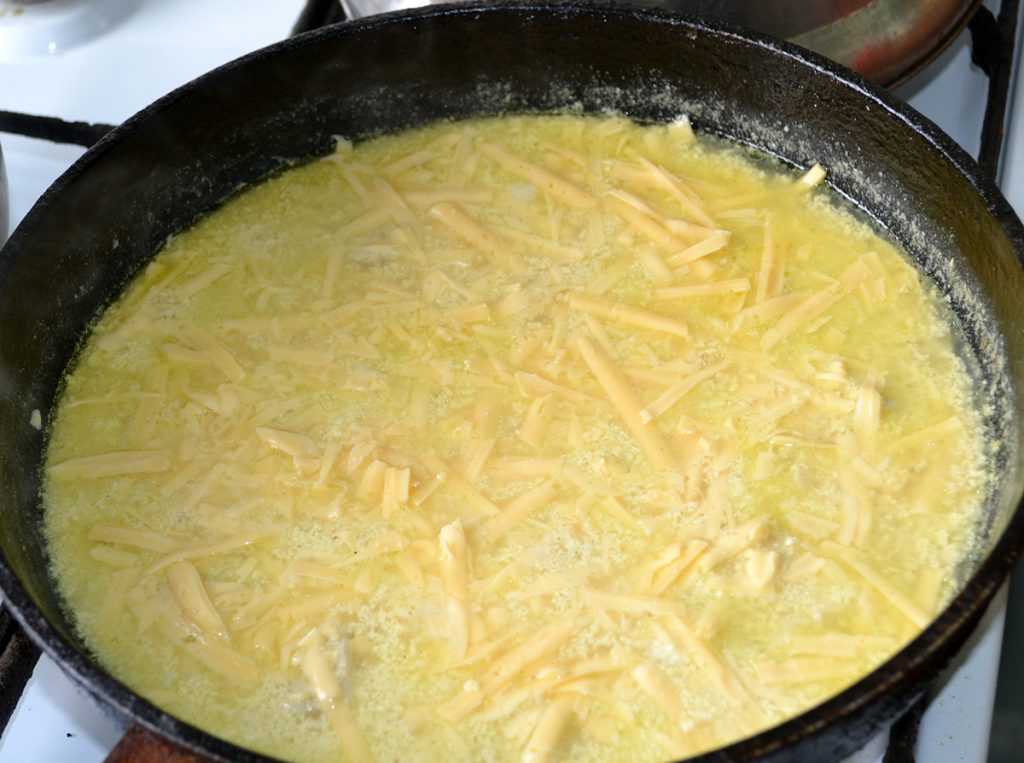 Теперь выкладываем кусочки курицы, тщательно перемешиваем все кухонной лопаткой до однородности. Сбавляем огонь до минимума и варим блюдо около 3 минут.Затем посыпаем тертым сыром, снова перемешиваем, пробуем на соль и при необходимости добавляем, выключаем огонь, накрываем сковороду крышкой и оставляем на 1 — 2 минуты.