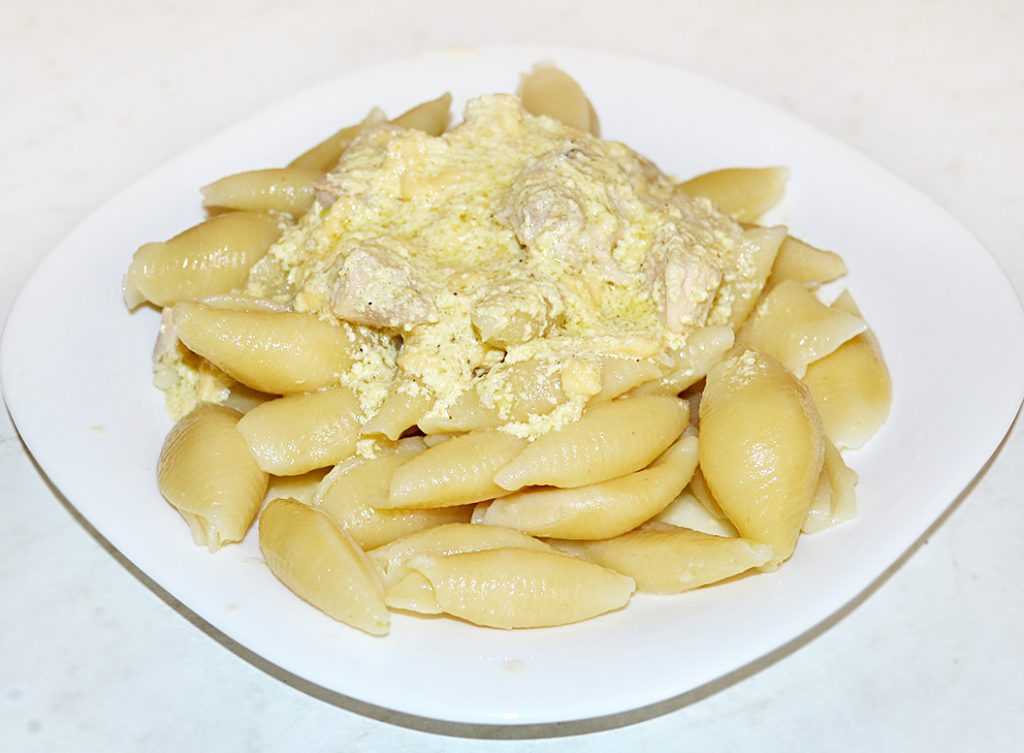 - Отварите макароны до полуготовности, выложите их в сотейник с соусом. Доведите все блюдо до готовности.
