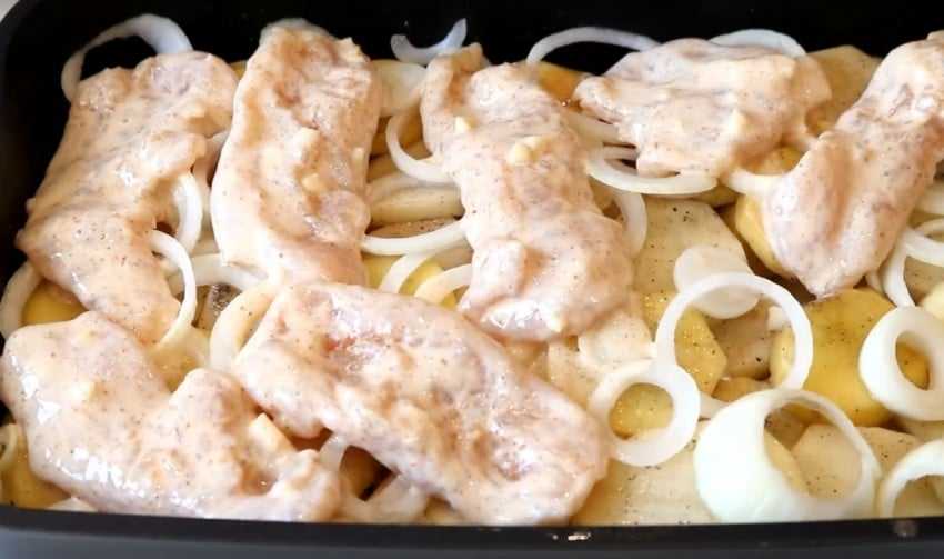8. Смажьте форму для выпекания маслом, выложите слой картофеля. Следующим слоем идёт лук, а уже на него выложите пропитавшееся маринадом куриное филе.