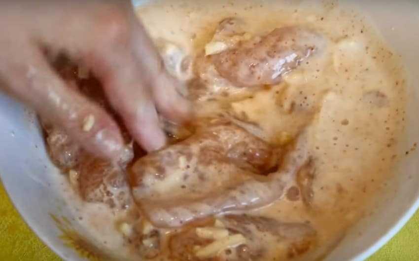 4. Выложите курицу в глубокую миску, сверху выложите чеснок и залейте кефиром. Жидкость должна покрыть все куски мяса.