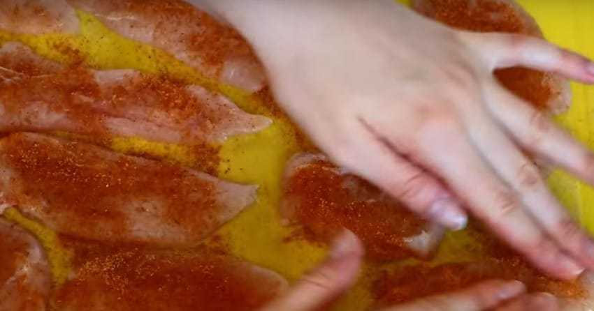 2. С 2-х сторон присыпьте филе приправой, для удобства можно втирать её руками.