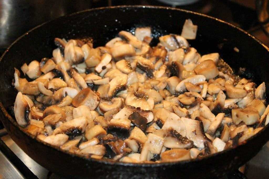Пока курица обжаривается, подготовим грибы. Мелко нарезаем шампиньоны и обжариваем на сковороде. Как только испариться вся вода перчим, солим и снимаем с огня.