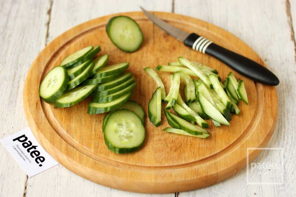 2. Свежие огурцы почистить от кожуры и нарезать полукольцами.