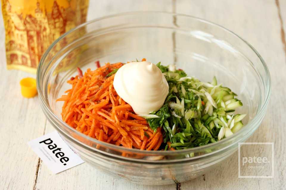 - Выложить морковь по-корейски. Сделать сеточку из майонеза.