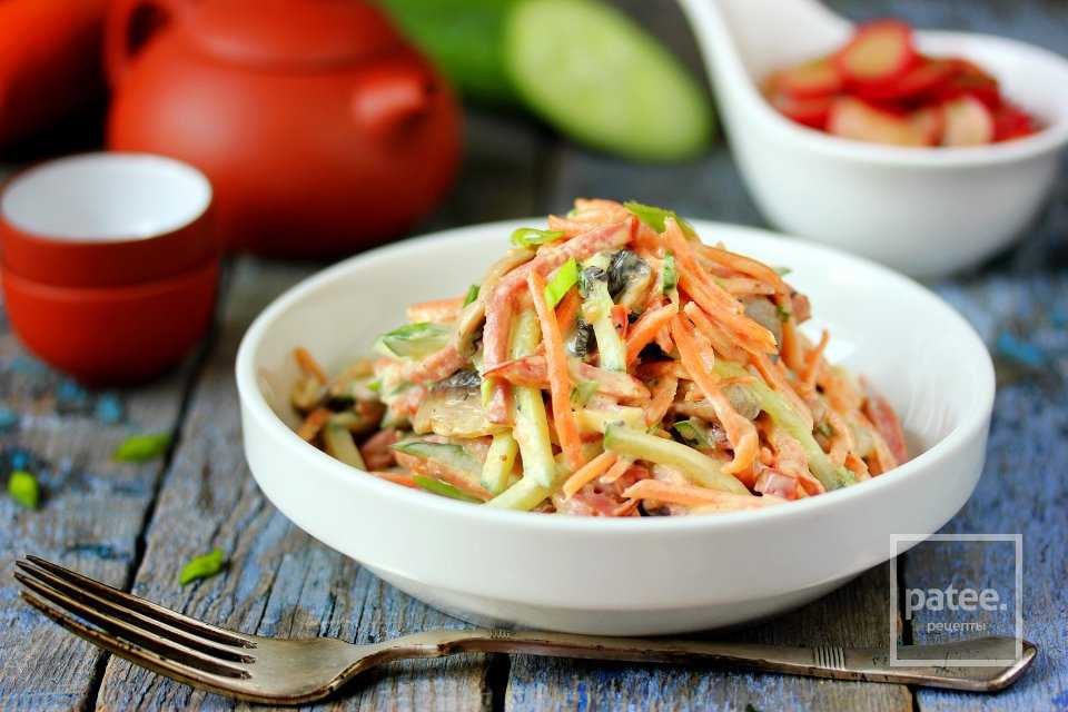 Большинство хозяек знает про этот вкуснейший рецепт салата с корейской морковью и копченой колбасой. Этот салат мало того, что получается очень вкусным, так он ееще и довольно простой в приготовлении, ингредиенты которого вы сможете с легкостью приобрести в любом магазин по доступным ценам.