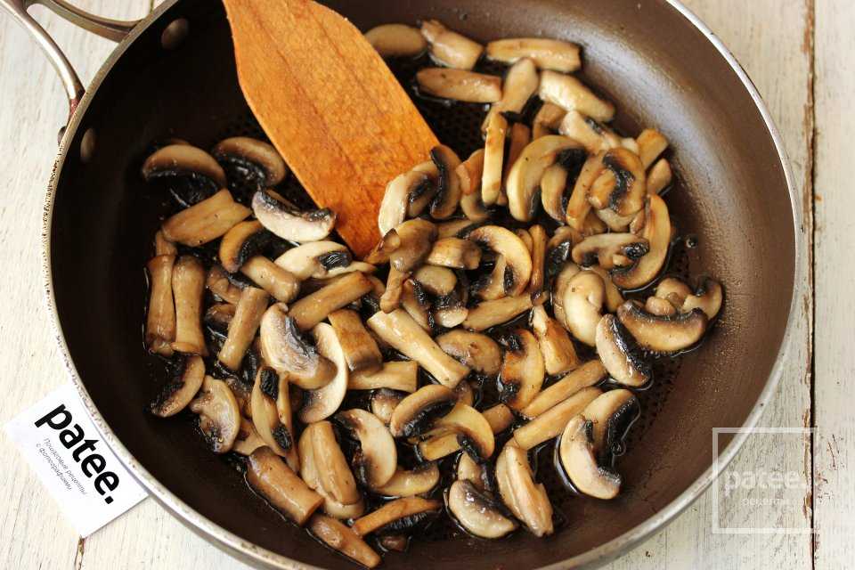3.В немного поджарившийся лук добавьте шампиньоны, перемешайте и продолжайте жарить. Грибы пустят сок, нужно подождать, когда он полностью выпарится.