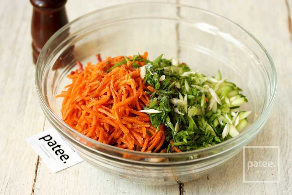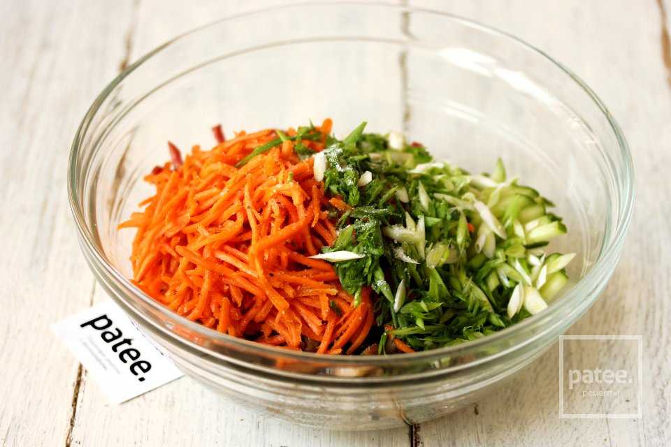 Салат с корейской морковью можно комбинировать и с огурцом, и с редькой, спаржей, и с зеленью – свежим зеленым луком, петрушкой, кинзой, укропом. Самой универсальной заправкой к таким салатам будет майонез или сметана. Салаты овощные с корейской морковкой можно заправлять оливковым маслом с горчицей и лимонным соком. Экспериментируйте и ориентируйтесь на свой вкус.