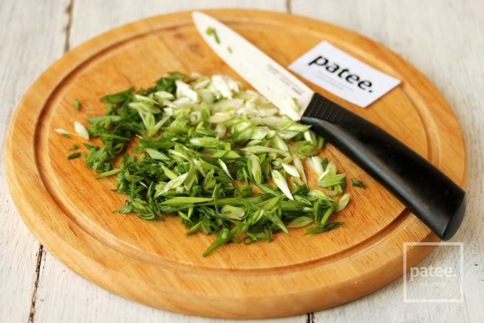 1. Капусту тонко нашинковать, посолить и помять руками.