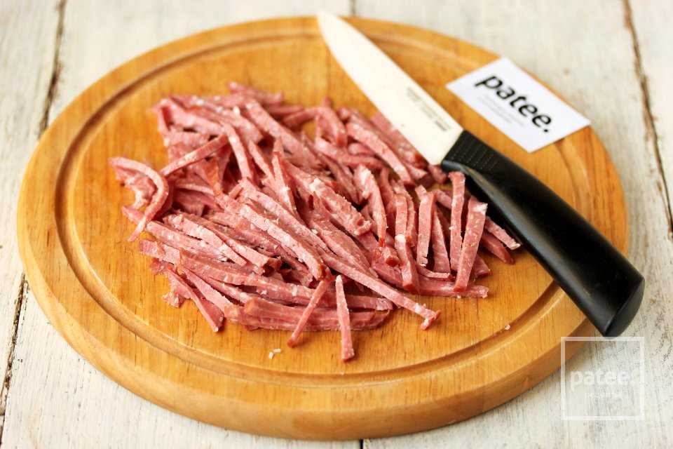 - Колбасу нарезаю средними брусочками. Копченый привкус сделает салат ароматным и аппетитным.