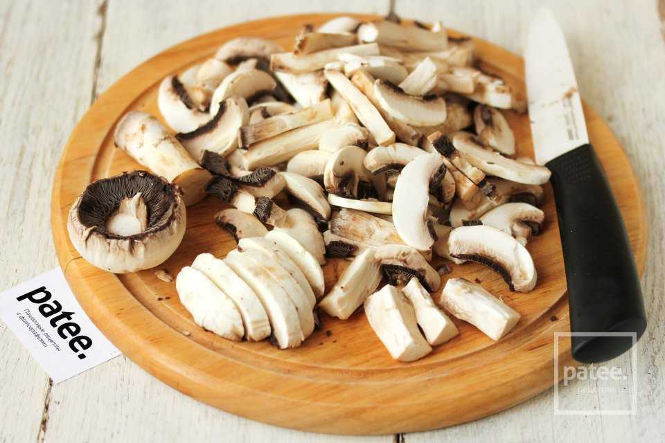 2.Тем временем у грибов снимите кожицу на шляпках. Нарежьте их пластинками, мельчить не нужно.