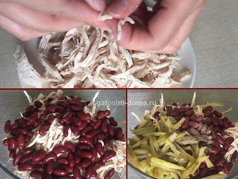 Сверху на мясо засыпаем 300 гр. консервированной красной фасоли. Соленые огурцы разрезаем тонкой соломкой. Их тоже потом выкладываем в общую салатницу.
