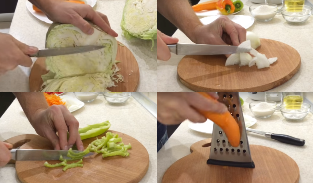 На приготовление салата из капусты со сладким перцем и морковью уходит чуть больше времени, чем на готовку классической версии блюда. Для того чтобы на столе появилась эта закуска, необходимо: