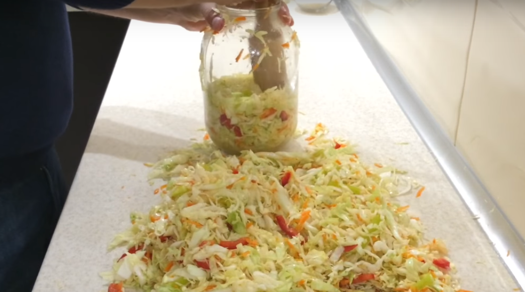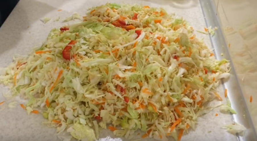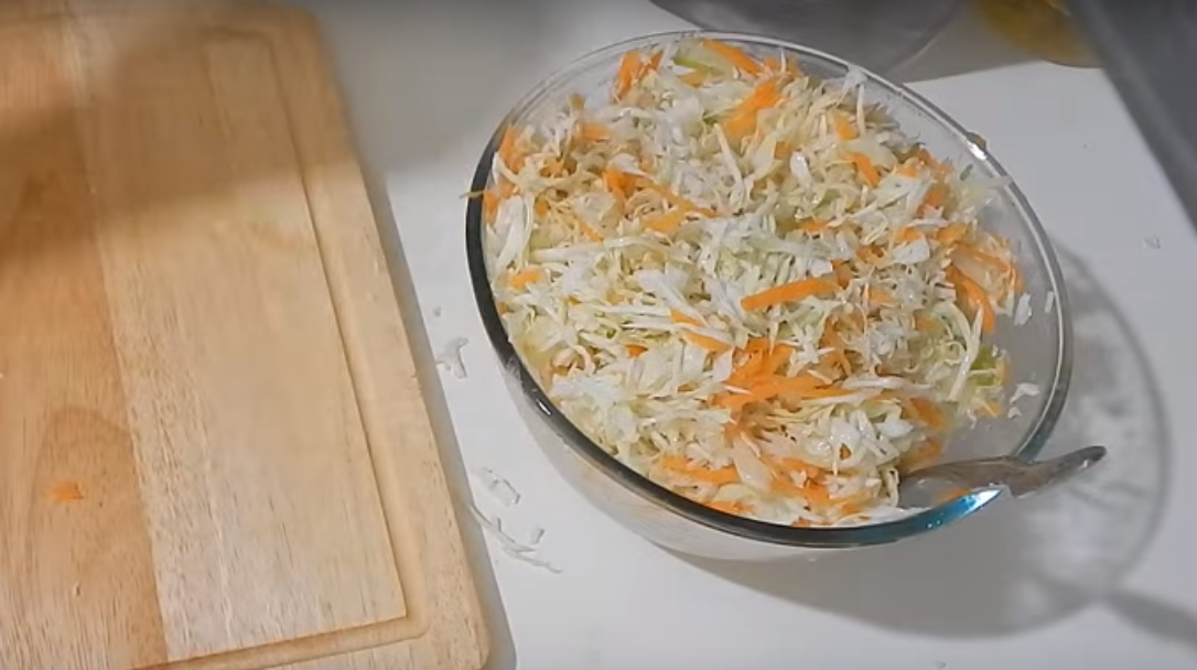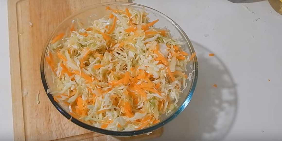 - нашинковать 1 кг белокочанной капусты, перетереть её с 50 г сахара и 1,5 ч. ложки соли и оставить настаиваться на 40 минут;