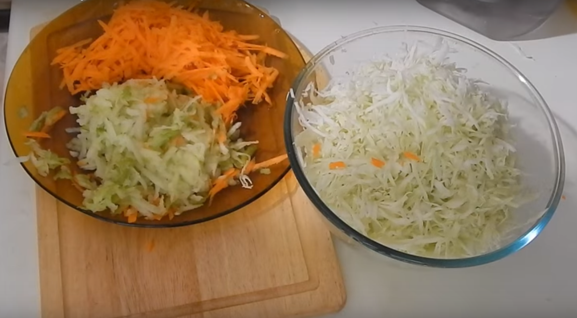 В равных количествах трётся на тёрке для корейской морковки огурец, морковка и тыква. Тыкву лучше порезать прямоугольником по ширине тёрки, и тереть прям со шкуркой — в итоге и руки целы и быстро потёрта тыква, а ненужная шкурка осталась и можно её утилизировать.